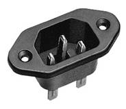 Socle connecteur 120°, 10 A, avec contact de protection, en option raccord à vis ou raccord enfichable 4,8 et 6,3 mm, bride longitudinale, écart entre les orifices de fixation 36 mm, fraisés. Matière thermoplastique, disponible en noir, blanc, et gris.